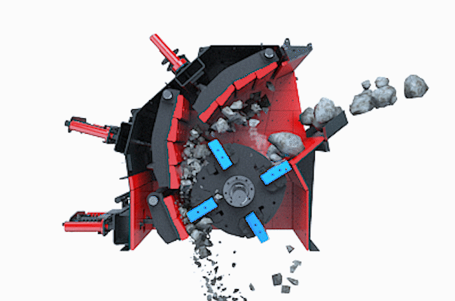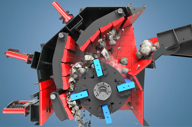 反擊式破碎機是一種利用沖擊能來破碎物料的破碎機械。本機工作時,在電動機的帶動下轉子高速旋轉,物料進入板錘作用區時,與轉子上的板錘撞擊破碎,后又被拋向反擊裝置上再次破碎,然后又從反擊襯板上彈回到板錘作用區重新破碎,此過程重復進行,物料由大到小進入一、二、三反擊腔重復進行破碎,直到物料被破碎至所需粒度,由出料口排出調整反擊架與轉子之間的間隙可達到改變物料出料粒度和物料形狀的目的。