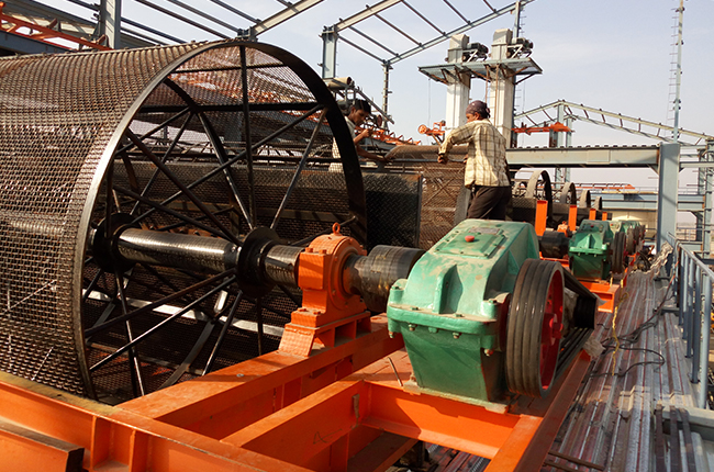 滾筒篩的電機經過減速機和滾筒裝置通過聯軸器鏈接在一起,通過驅動滾筒裝置圍繞其軸線轉動,當物料進入滾筒裝置后傾斜于轉動,使物料翻轉與滾動,將合格的物料經過滾筒外圓篩網排出,將不合格的物料經過滾筒末端排出,物料在滾筒內來回翻轉和滾動,篩孔中的物料被彈出,可以放置篩孔堵塞。
