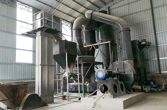 大塊石料在破碎機充分破碎后,由斗式提升機送至儲料斗,之后由電磁振動給料機有序送至主機內研磨。主機內懸掛于梅花架上的磨輥裝置繞中心軸旋轉,磨輥同時繞磨輥軸自轉,在離心力的作用下,磨輥向外擺壓緊磨環,旋轉的鏟刀鏟起的物料被拋向輥環之間,因磨輥的滾碾以達到粉碎和研磨作用。磨碎室的粉末被鼓風機的氣流吹到主機上方的分析機進行分析,細度過粗的石粉由于自重則落入主機內重磨,合格細粉則隨風流進入到大旋風收集器,收集后經出料管排出即為成品。