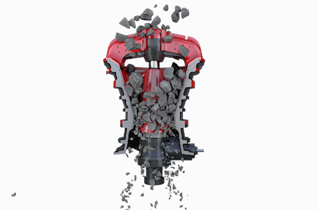 利用破碎錐在殼體錐腔內的旋轉運動來擠壓、劈裂和彎曲物料,對各種硬度的礦石或巖石進行粗碎。裝有破碎錐的主軸上端支撐在橫梁中部的襯套內,下端置于軸套的偏心孔內。當軸套旋轉時,破碎錐繞機器中心線偏心運動。它的破碎動作是連續的,所以它的工作效率比顎式破碎機高。