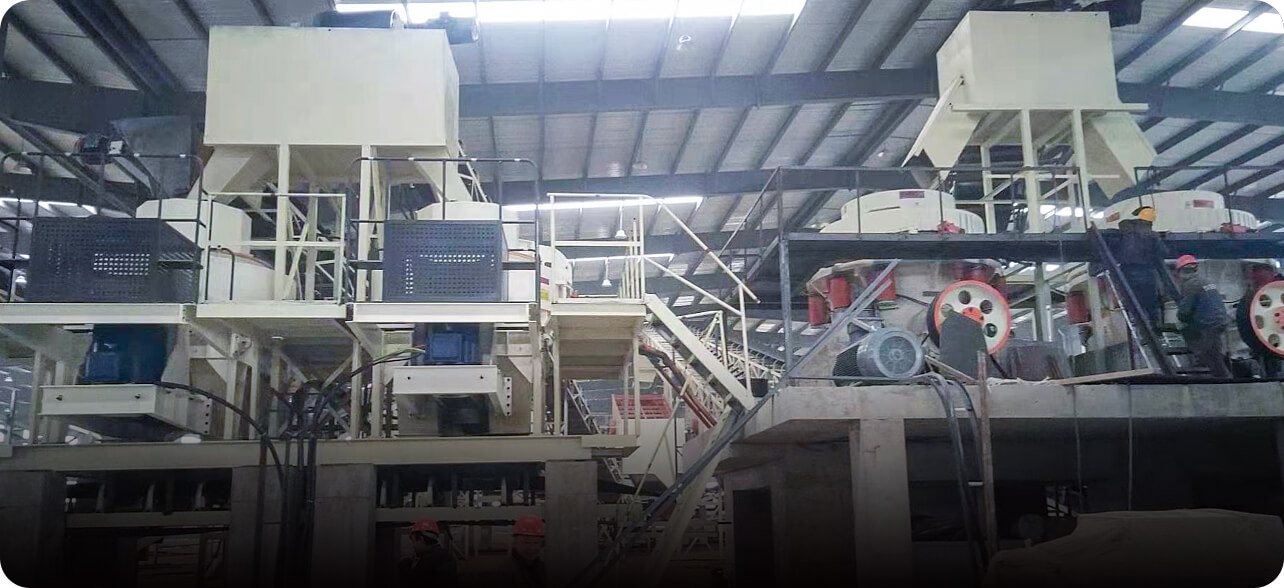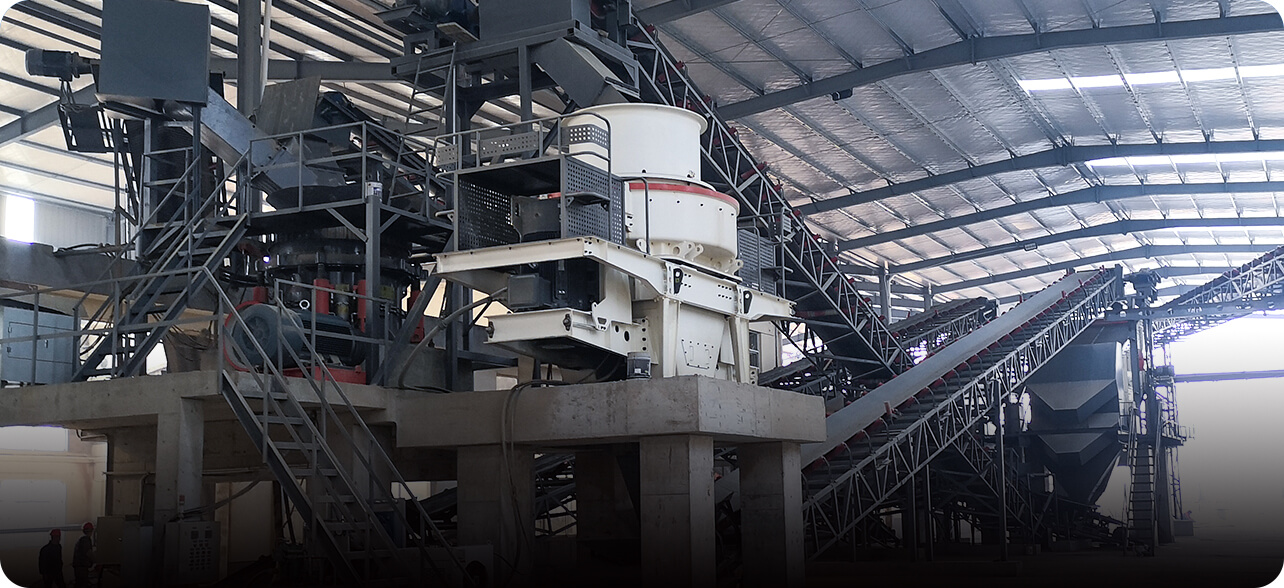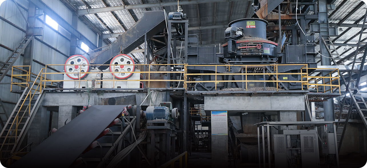 組成設備:給料機、鄂破、反擊破、圓錐破、制砂機、振動篩、洗砂機、皮帶輸送機、集中電控設備等